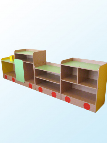 изготовлена из ЛДСП, торцы облицованы кромкой ПВХ 2 мм. Состоит из двух секций: нижняя секция имеет 2 двери и 4 открытых ячейки, верхняя секция имеет 2 открытые полки и пикообразную надстройку. Стенка снабжена ножками-опорами регулируемыми по высоте, на дверях установлены ручки-кнопки