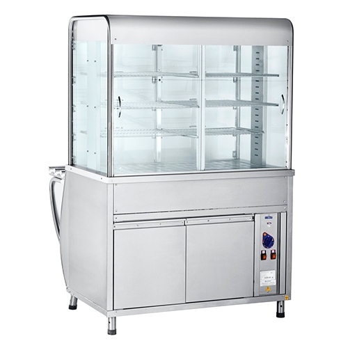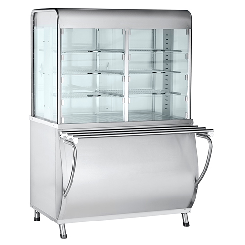 Диапазон регулирования температуры воздуха в витрине теплового прилавка 20...60°С, время разогрева до рабочей температуры: 40мин. Демонстрационная площадь: 2,04 м2. Витрина снабжена тремя ярусами полок-решеток, тремя лампами освещения и обладает возможностью принудительной конвекции и пароувлажнением. Направляющие для подносов и регулируемые по высоте ножки входят в комплект поставки.