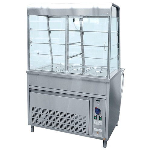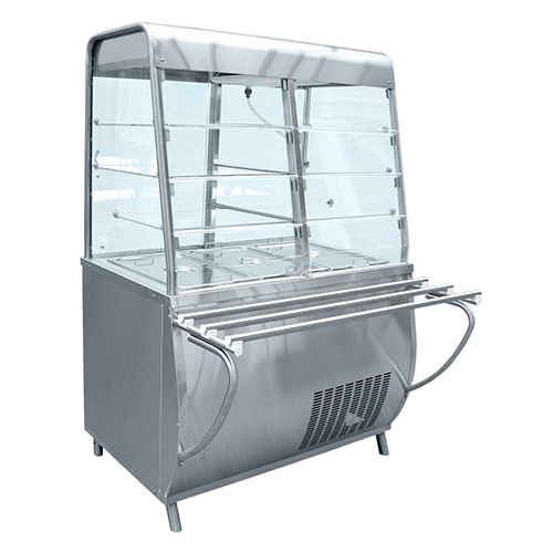 Плавная регулировка температуры 1...10°С. Хладагент: R404A. Внутренний объем закрытой витрины имеет принудительную циркуляцию охлажденного воздуха и 2 лампы подсветки. Демонстрационная площадь охлаждаемой ванны 0,49 м2, полкок: 1,34 м2. Внизу - нейтральный шкаф без дверок. Регулируемые по высоте ножки, полки, 3 гастроемкости GN 1/1-150 и направляющие для подносов входят в комплект поставки.