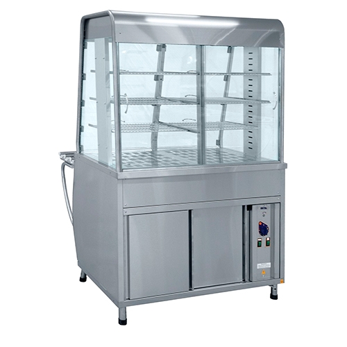 Диапазон регулирования температуры воздуха в витрине теплового прилавка 20...60°С, время разогрева до рабочей температуры: 40мин. Демонстрационная площадь: 1,34 м2. Витрина снабжена тремя ярусами полок-решеток, тремя лампами освещения и вентилятором, закрытым кожухом. Направляющие для подносов и регулируемые по высоте ножки входят в комплект поставки.