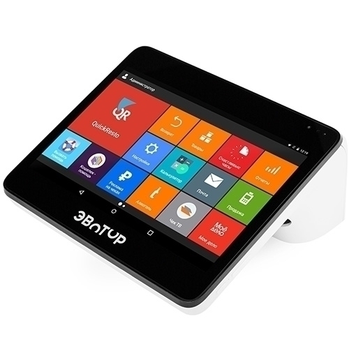 Эвотор 10 – онлайн-касса с 10-дюймовым экраном для кафе и ресторанов. Это самый большой экран в линейке – пробивать блюда и товары удобно. Касса работает без проводов: можно торговать и в ресторане, и на фестивале в палатке. Соответствует 54-ФЗ: подключается к любому оператору фискальных данных и передает данные в ФНС.